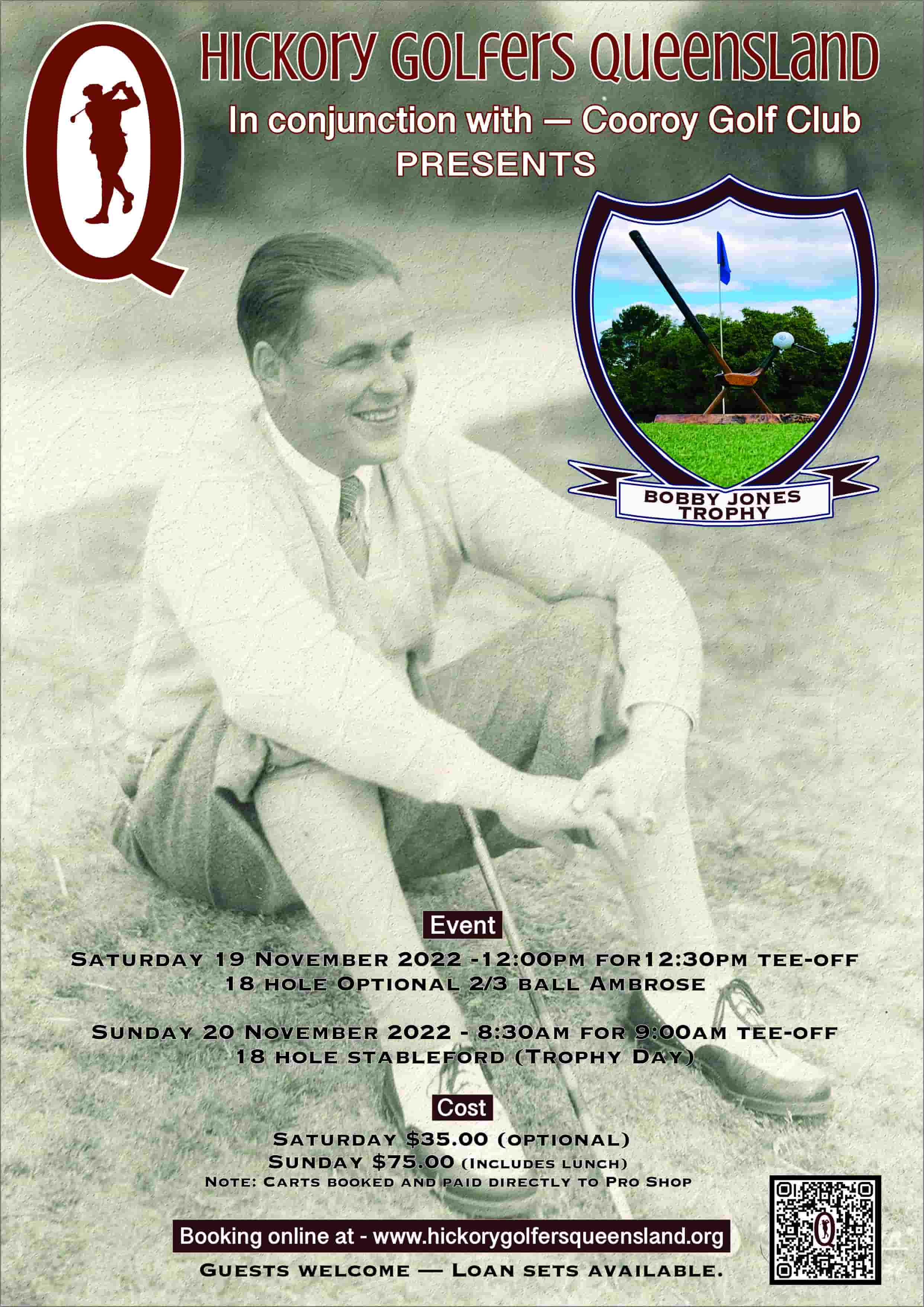 The annual Bobby Jones Trophy, a two day event with the Bobby Jones Trophy being played for on Saturday over 18 hole gross and stableford, Sunday morning will be a 9 hole 2 ball ambrose starting at 8.30am. The event is organized by Cooroy Golf Club and supported by Hickory Golfers Queensland..