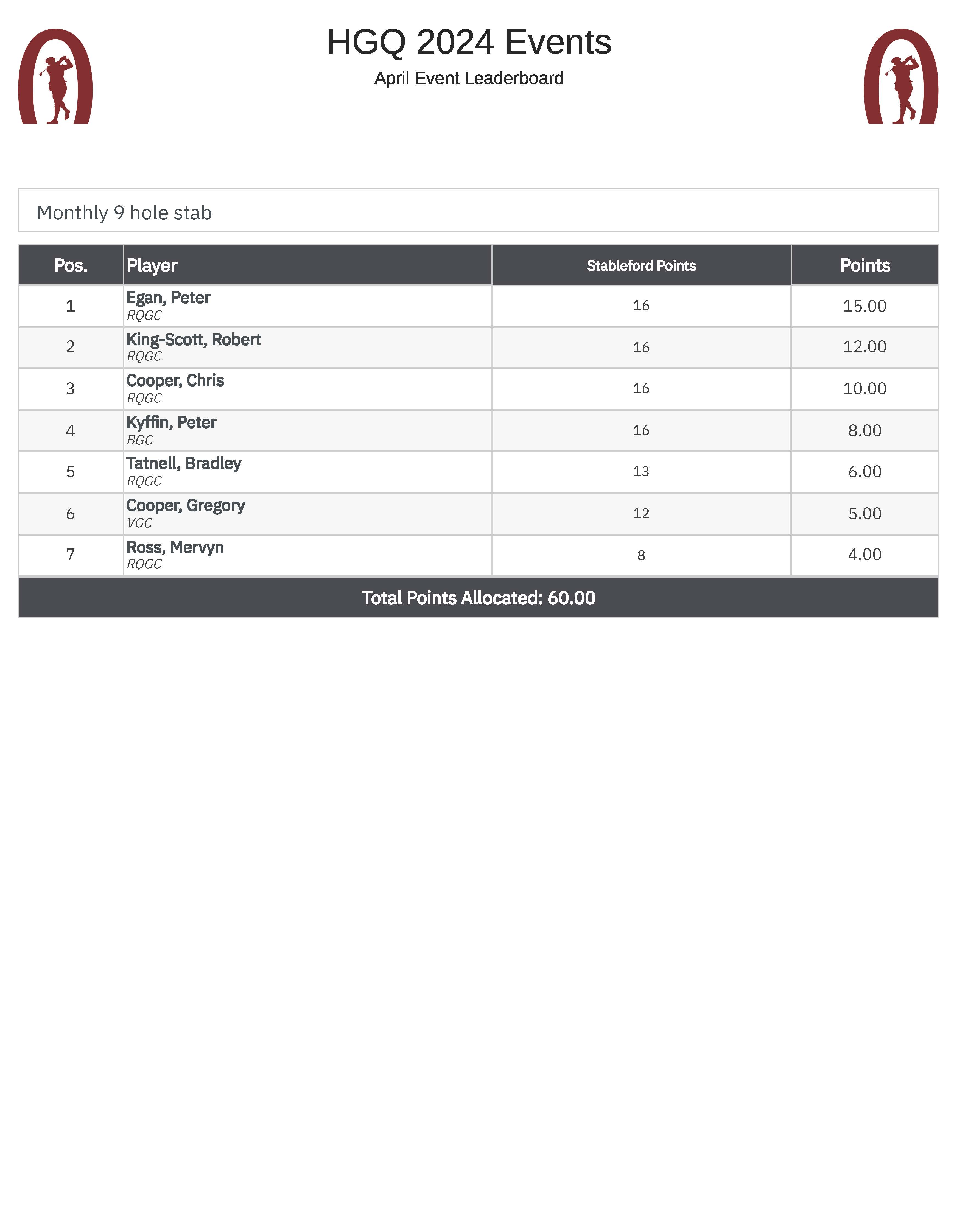 Peter Egan, Rob King-Scott and Chris Cooper all returned 16 points.