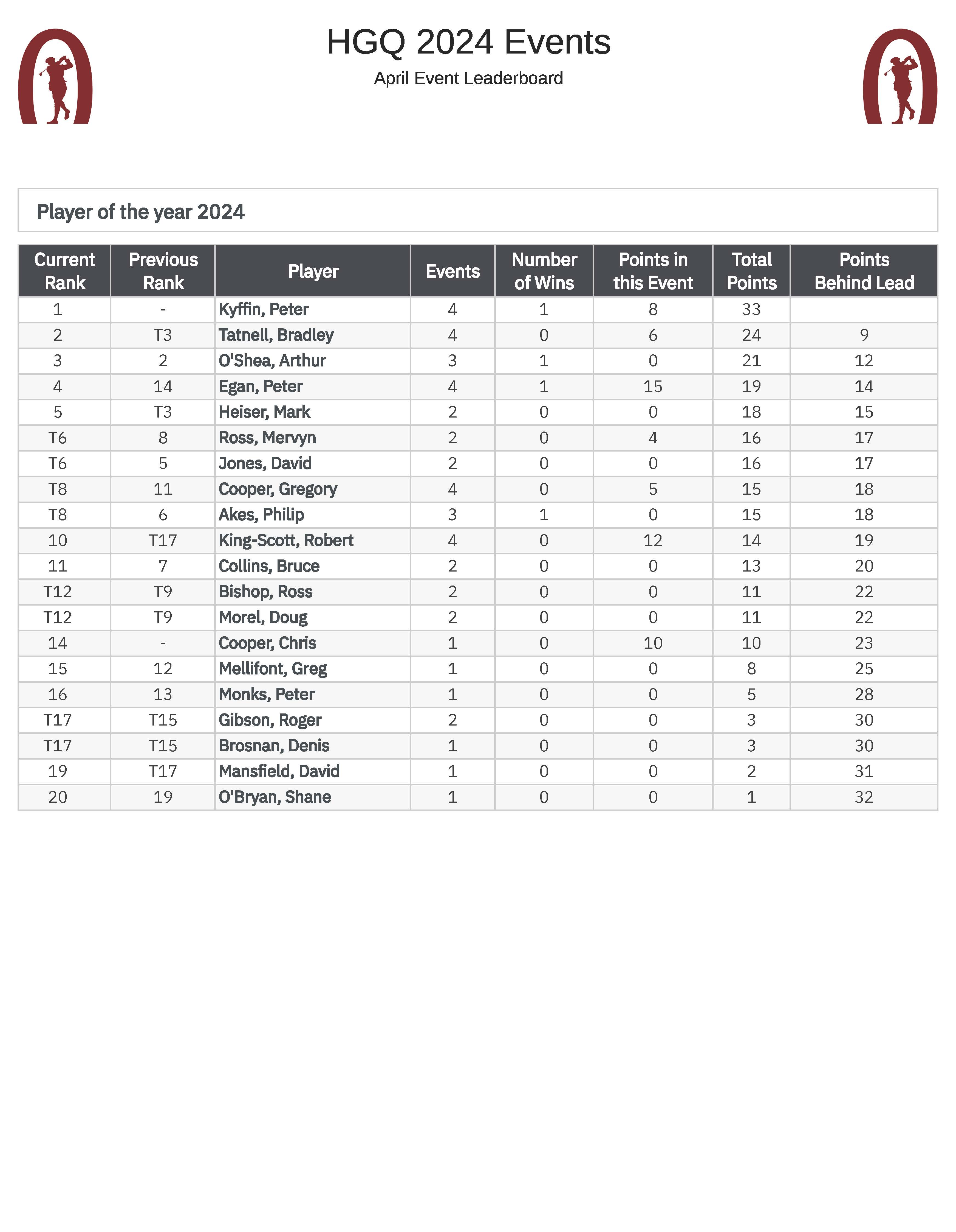 Nobody managed a 4 pointer in April so the table remains unchanged from last month.