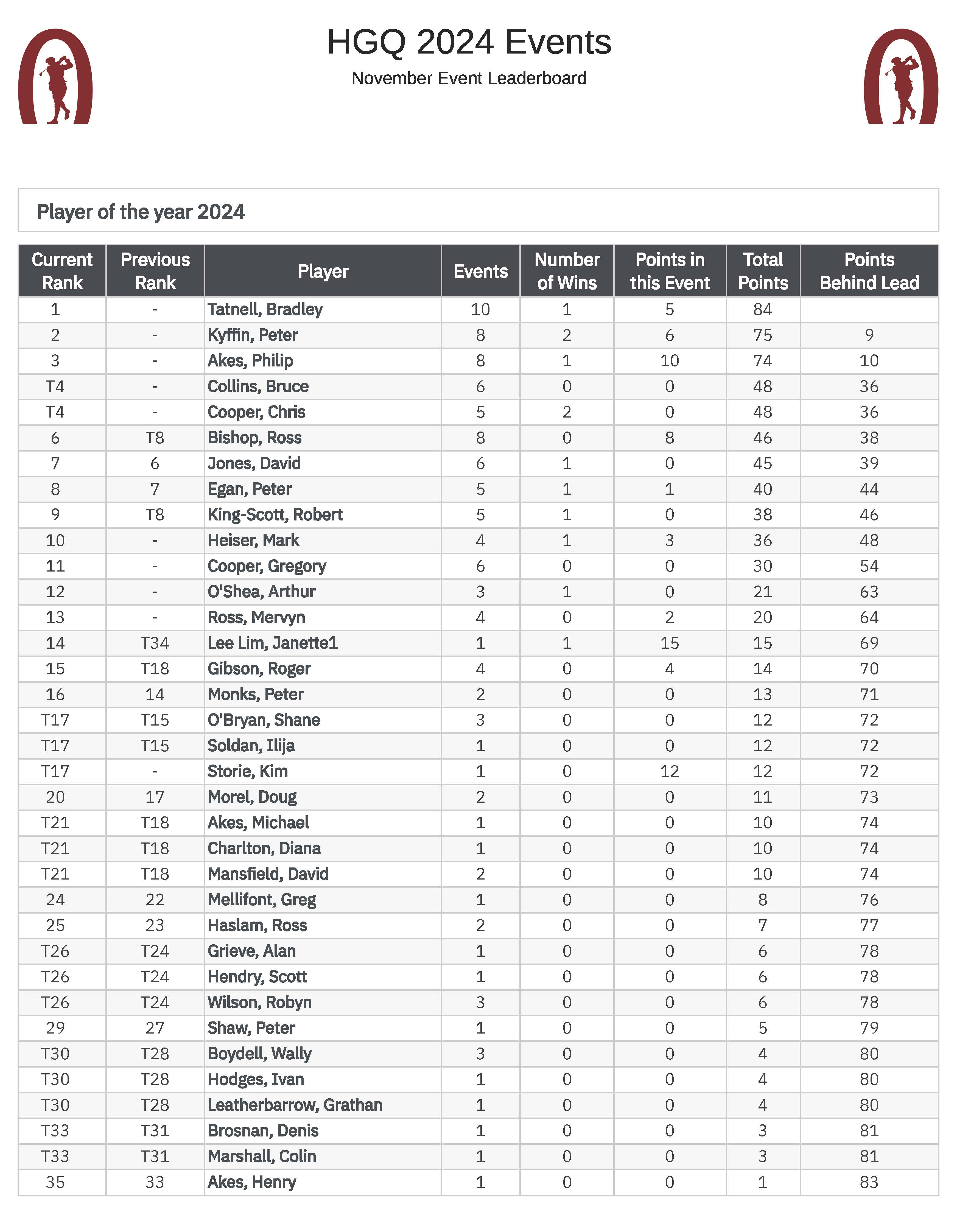 Bradley only enjoyed one win during the season however he showed that consistent results and a high attendance rate are the key to winning the major prize of the HGQ calendar.
