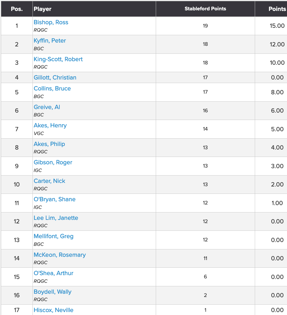 Interestingly, the winning score was the same as last year with Ross Bishop taking the honours with 19 points, Peter Kyffin was second with 18 points on a count back from Rob King-Scott. Our host Christian performed very well at his first attempt at hickory scoring 17 points including a birdie on the 8th.