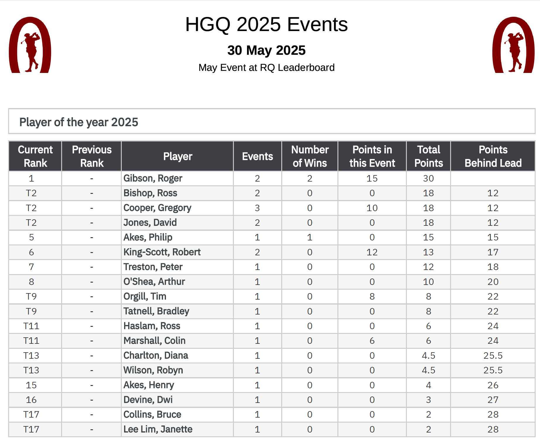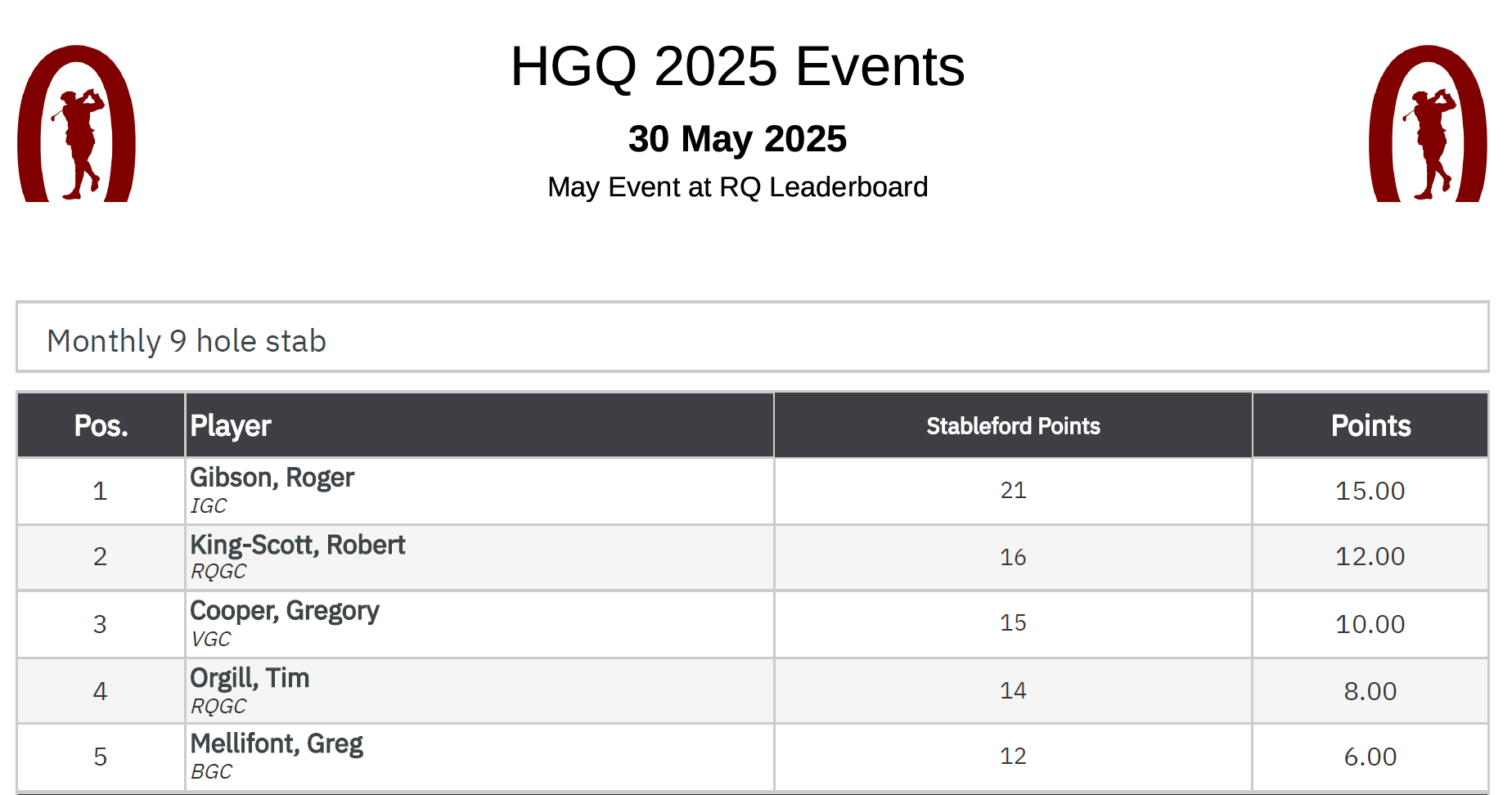 The Treasurer shined in the wet conditions and Roger Gibson won the event with a very creditable score of 21 points. President Rob came in second with 16 points and Greg Cooper third with 15 points.