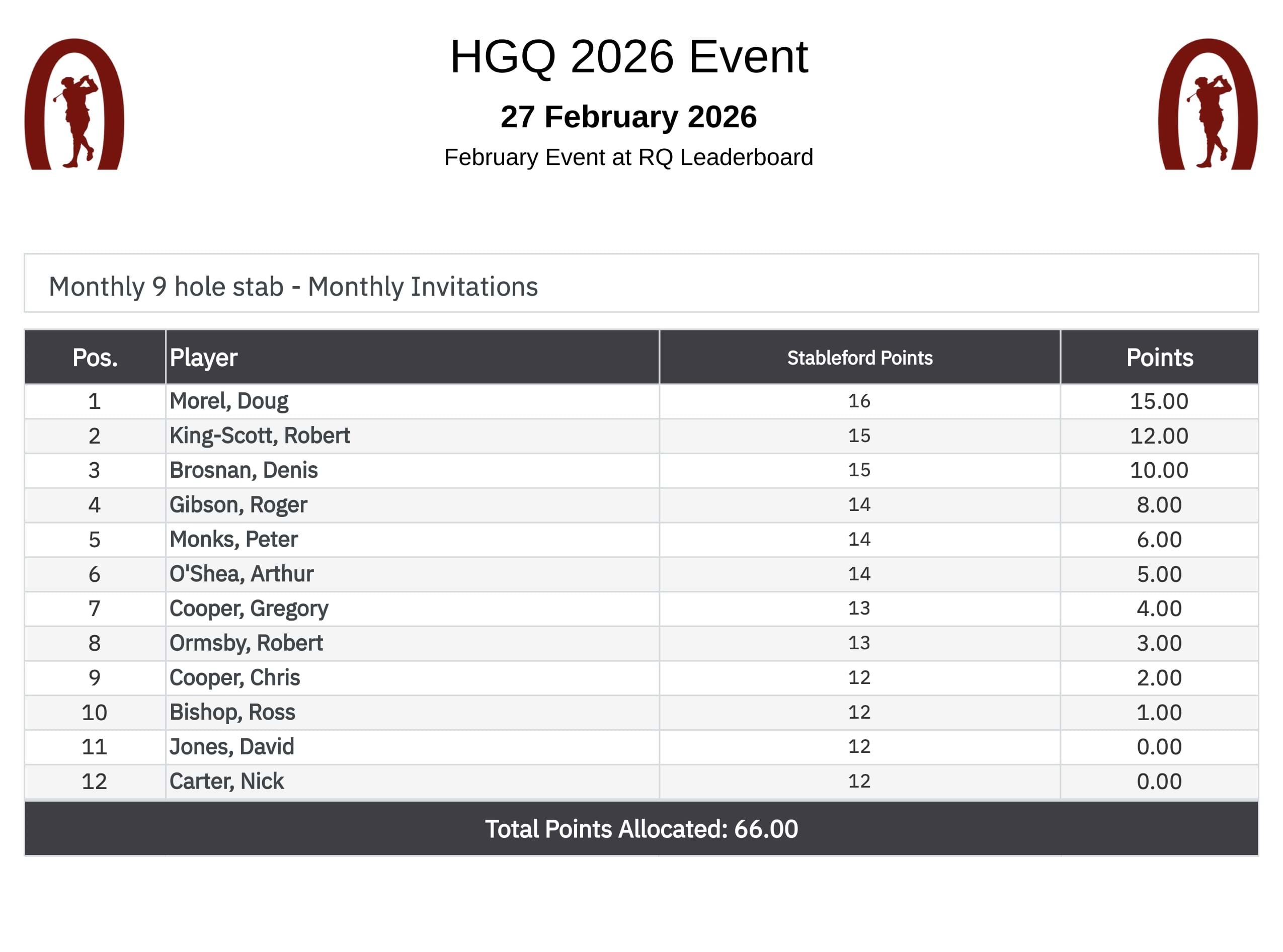 Doug Morel won the day with 16 points. In second and third places were Rob King-Scott and Denis Brosnan with 16 points. An adjustment to the handicapping methodology produced more realistic results. Again, No 4 pointers were recorded. Apologies to Chris Holmes who does not appear in the results with 10 points. Which will be rectified by next month.