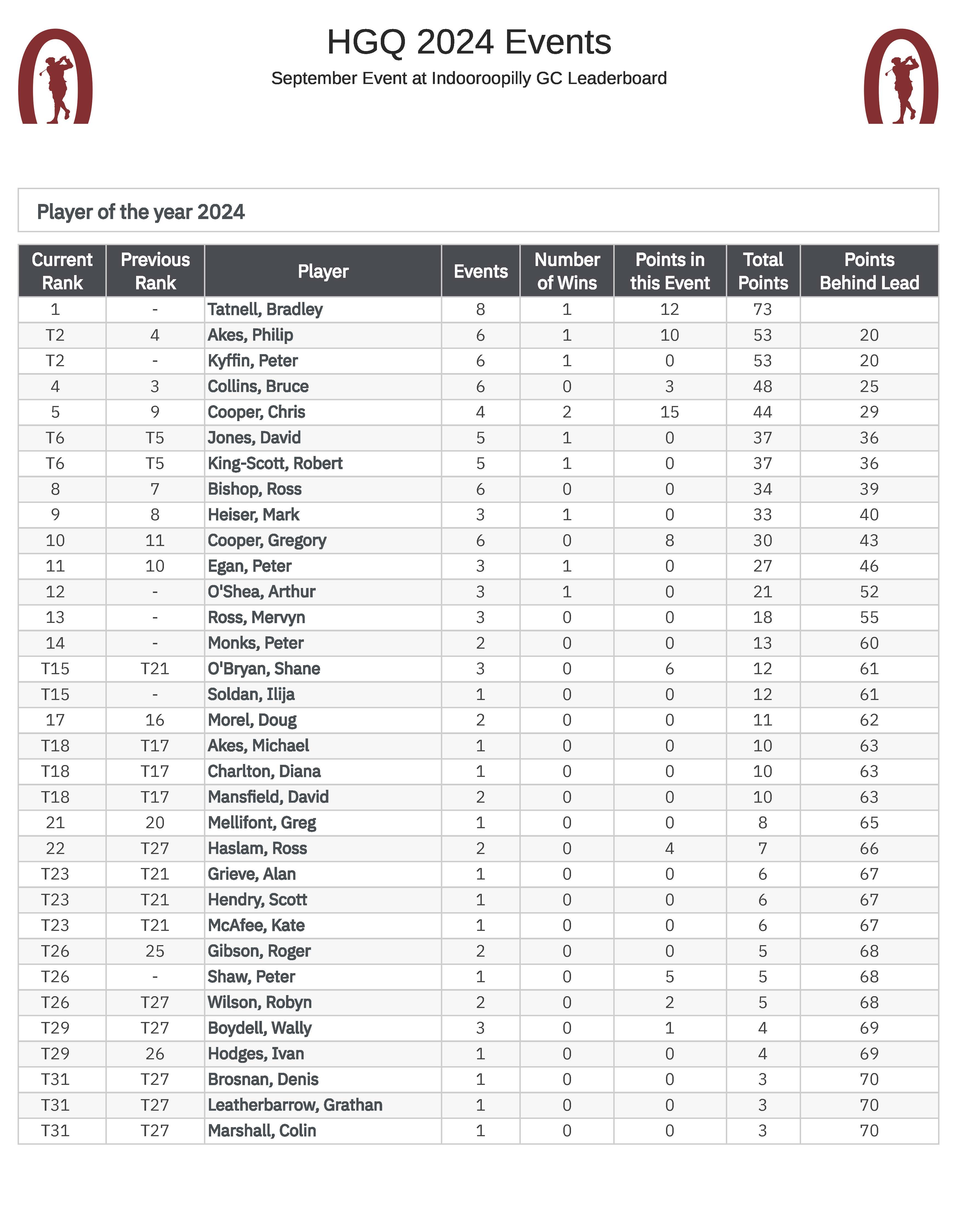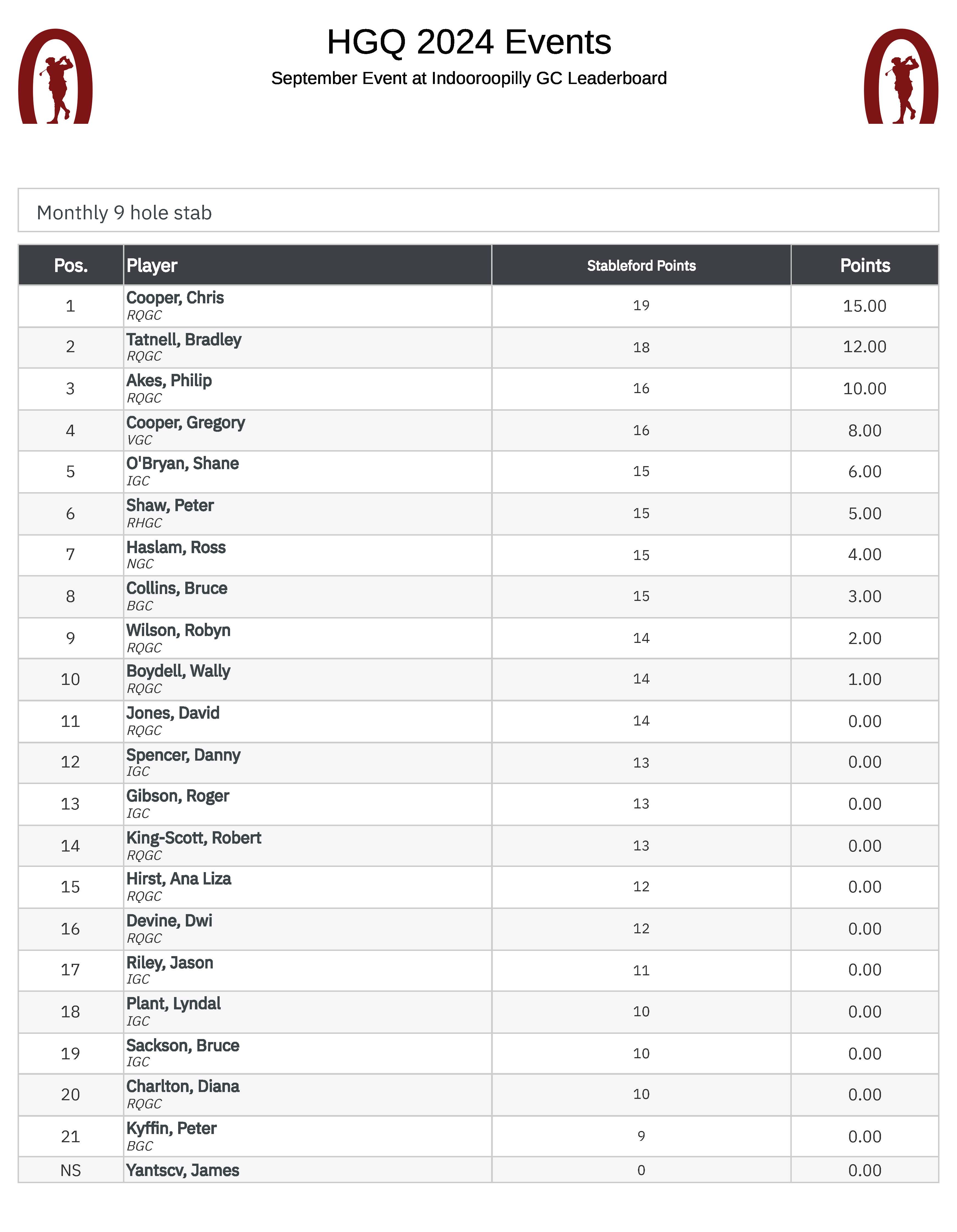 Chris Cooper took the honours with 19 points followed by Bradley Tatnell in second place, 18 points. Third was Philip Akes. Five ladies played in the event with Robyn Wilson being the best performer with 14 points.